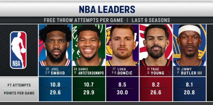 近6赛季场均罚球TOP5:恩比德 字母哥 东契奇 特雷-杨 巴特勒