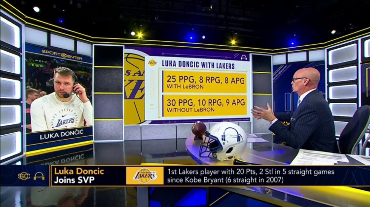 加盟湖人后 当詹姆斯出场时东契奇场均25+8+8 无詹场均30+10+9