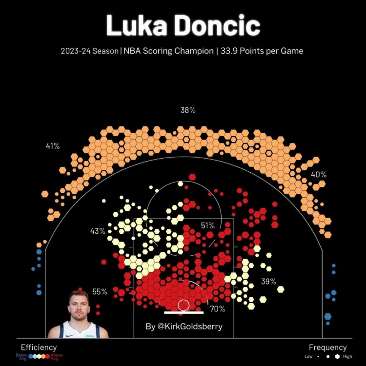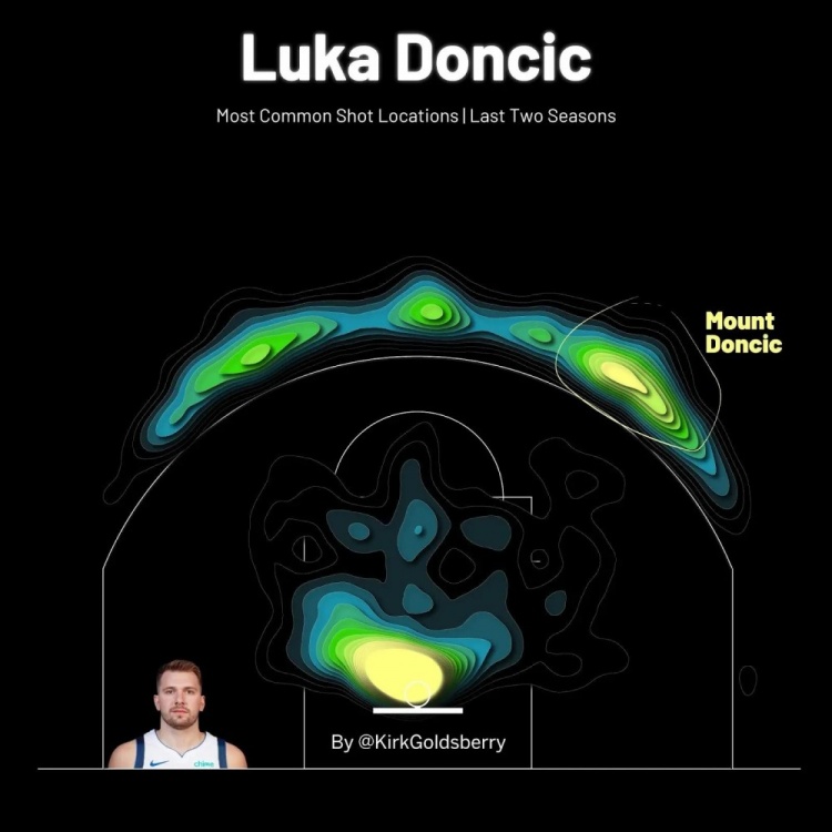 当你绘制出东契奇最常见的投篮位置时,有两个热点:一个在篮筐附近,另一个是在三分线外左侧45度处。这个外线热点正是东契奇在周日的比赛中让布劳恩上当的地方——这也是东契奇最喜欢的起舞的位置。