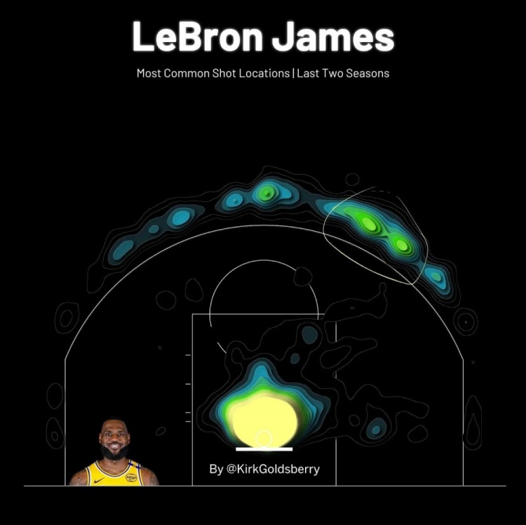 这与卡尔-马龙和约翰-斯托克顿的情况不同。詹姆斯和东契奇都喜欢球场上的相同位置,两人都偏爱三分线外左侧45度以及突破至篮下。