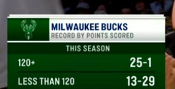 本赛季雄鹿得分120+的比赛25胜1负 得分少于120分的比赛13胜29负
