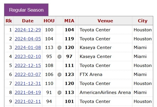 这样一来,火箭结束了自己对热火的常规赛9连败,具体如下: