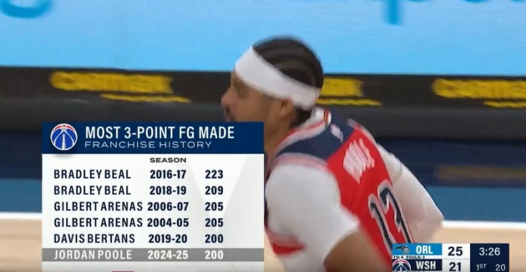 首节比赛,普尔命中2记三分,本赛季他已经投进了200记三分,距比尔保持的奇才队史最高纪录还差23记。