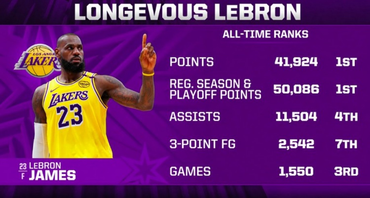老詹41924分历史第一;常规赛+季后赛50086分第一;总助攻11504第4;总三分命中2542个历史第7;出战1550场历史第3