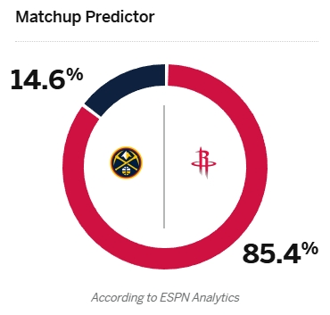 - 约基奇缺阵!火箭10连胜稳了?ESPN预测明日胜率:火箭高达85.4%