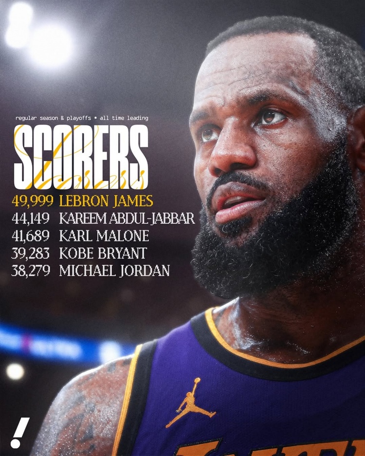 - 历史总得分榜:老詹49999第一 天勾第二压邮差 科比乔丹分列四五