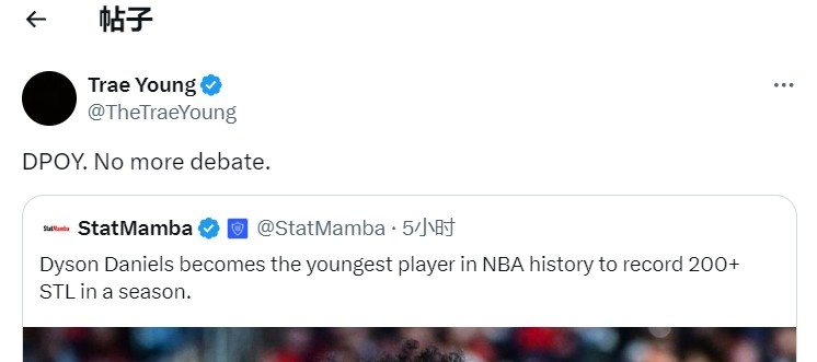比赛结束后,老鹰球星特雷-杨转发了丹尼尔斯的这一数据,并在旁边写道:“年度最佳防守球员。停止争论。”