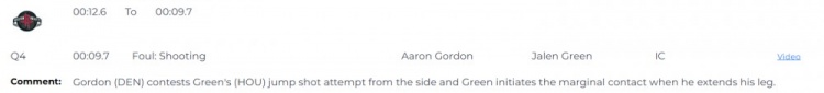比赛最后9.7秒,戈登(掘金)从侧面干扰杰伦-格林(火箭)的投篮出手,格林在伸腿时主动制造了轻微接触。