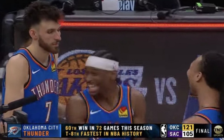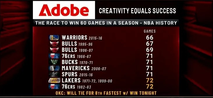 雷霆仅用72场就获60胜&平NBA历史第八快 第一快是16年勇士的66场