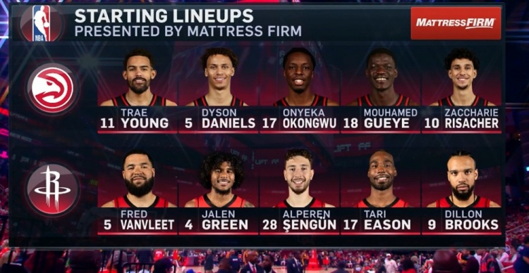 老鹰首发:特雷-杨、丹尼尔斯、奥孔武、默罕默德-盖耶、里萨谢。