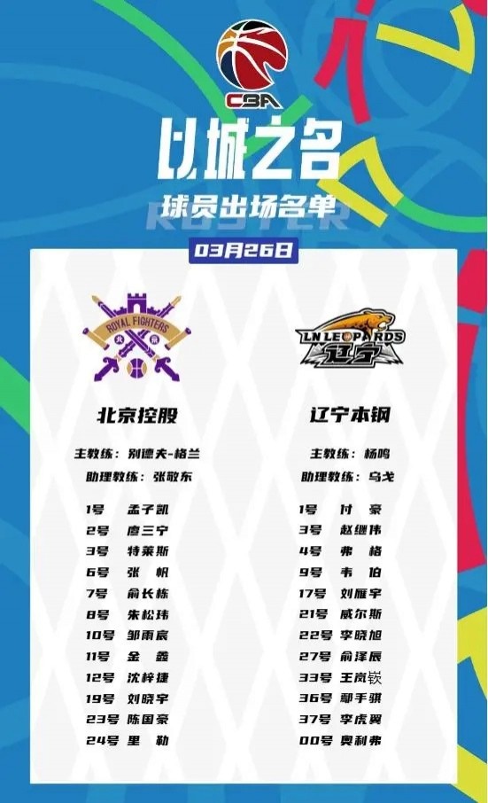 - 北控VS辽宁大名单:廖三宁赵继伟领衔 弗格在列 韩德君张镇麟缺阵