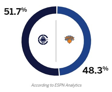 ESPN给出了本场比赛胜率预测,其中快船51.7%,尼克斯48.3%。