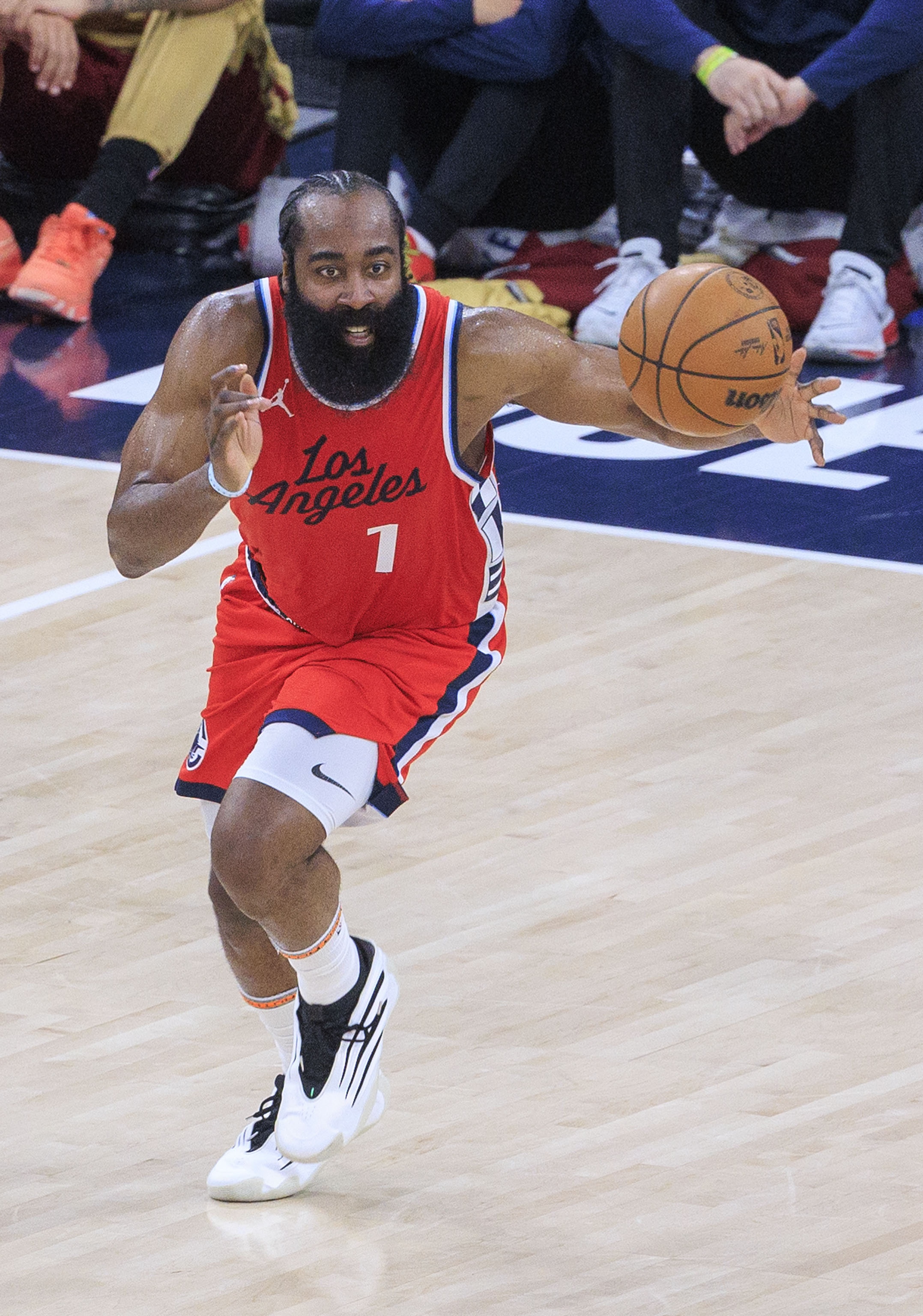 3月27日讯 NBA常规赛,快船对阵尼克斯,哈登前三节爆砍29分5篮板6助攻。