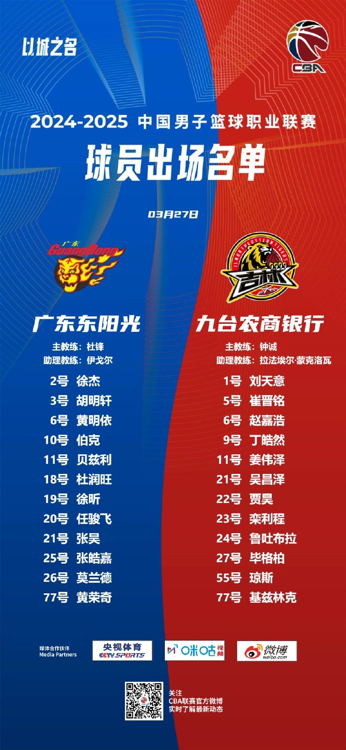 - 广东VS吉林大名单:徐杰胡明轩姜伟泽领衔 吉伦沃特继续缺阵