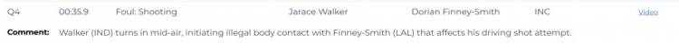 比赛最后35.9秒,湖人118-119落后一分,步行者球员贾雷斯-沃克防守时半空中转身,与芬尼-史密斯发生非法身体接触,影响了后者的上篮出手,此为犯规漏吹,芬尼-史密斯应该获得两罚。