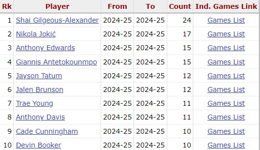 据统计,这是亚历山大本赛季第25场比赛至少35分,联盟最多,其余人最多17次。