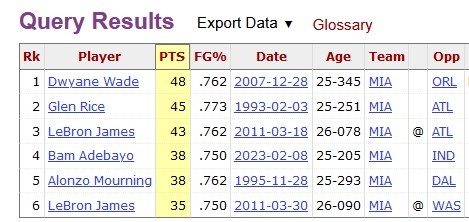 据统计,希罗(25岁67天)成为热火队史单场砍下至少35分且投篮命中率75%+最年轻的球员。榜单其余球员如下: