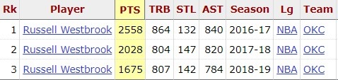 - 威少目前总得分、助攻和抢断都进了历史前20 仅他和詹姆斯做到