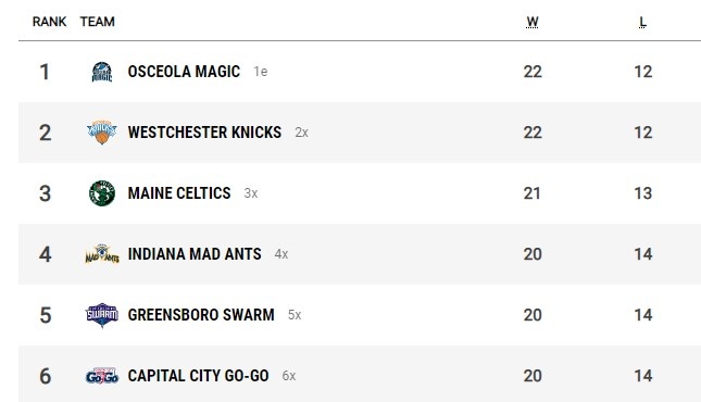 G联赛常规赛东西部前六晋级季后赛,东西部第1、第2名直接晋级分区半决赛。常规赛排名东西部前六的球队如下: