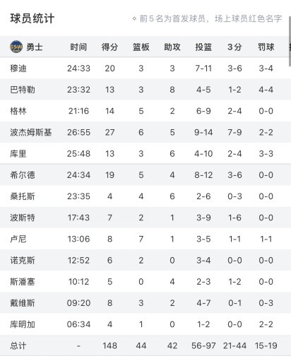 - 全员发挥!勇士出战13人全部都有得分入账 库追巴只出战3节