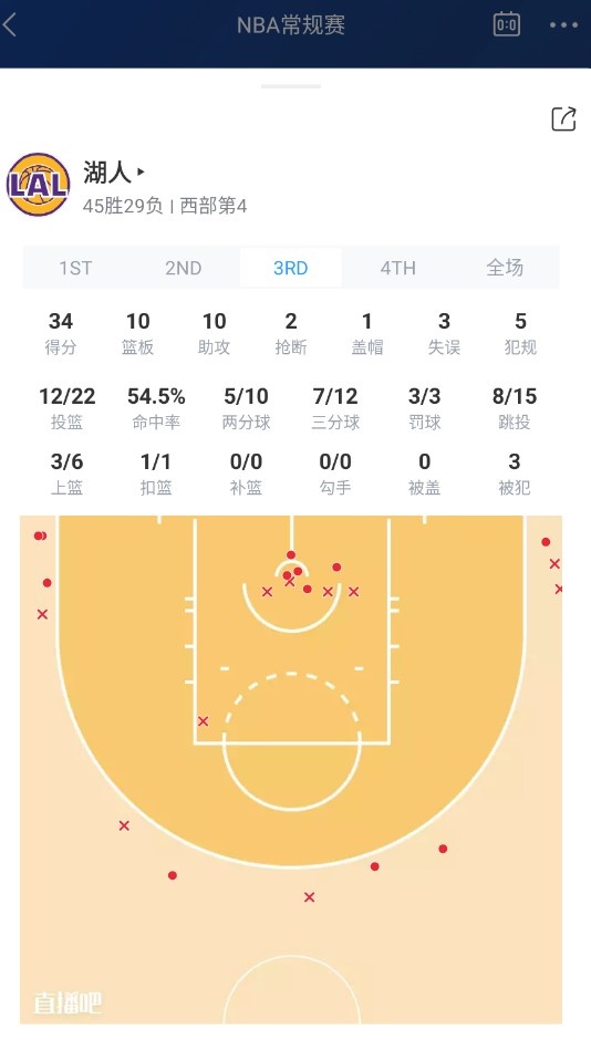第三节,湖人外线火力全开,单节三分12投7中,单节轰下34分,净胜火箭5分。
