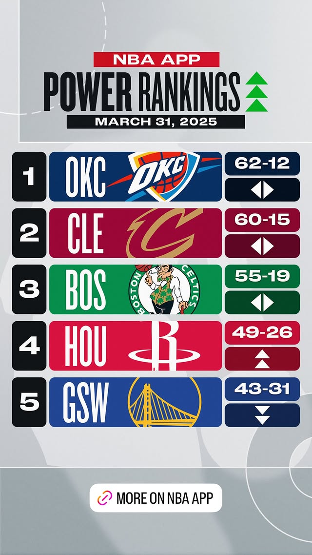 04月01日讯 今日NBA官方更新了最新一期战力榜。雷霆仍居第一,近13场12胜的火箭狂飙4位升至前四,湖人跌出前五。
