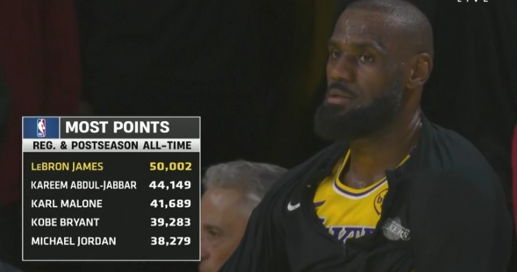 截至发稿前,湖人球星詹姆斯已拿到3分,总得分来到50002分,继续高居联盟历史第一。