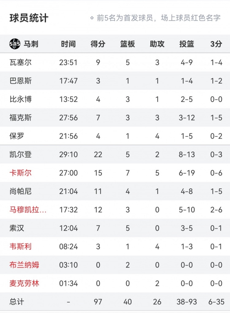 本场比赛,马刺首发球员均表现低迷、没有人得分上双。具体如下: