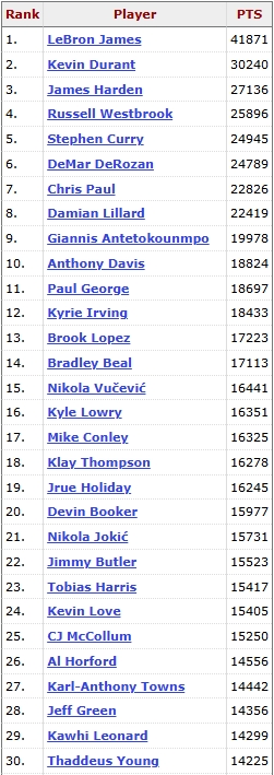 各位吧友们认为,谁将成为现役第10位20000分先生?现役得分Top30里,谁还有望达成该成就?