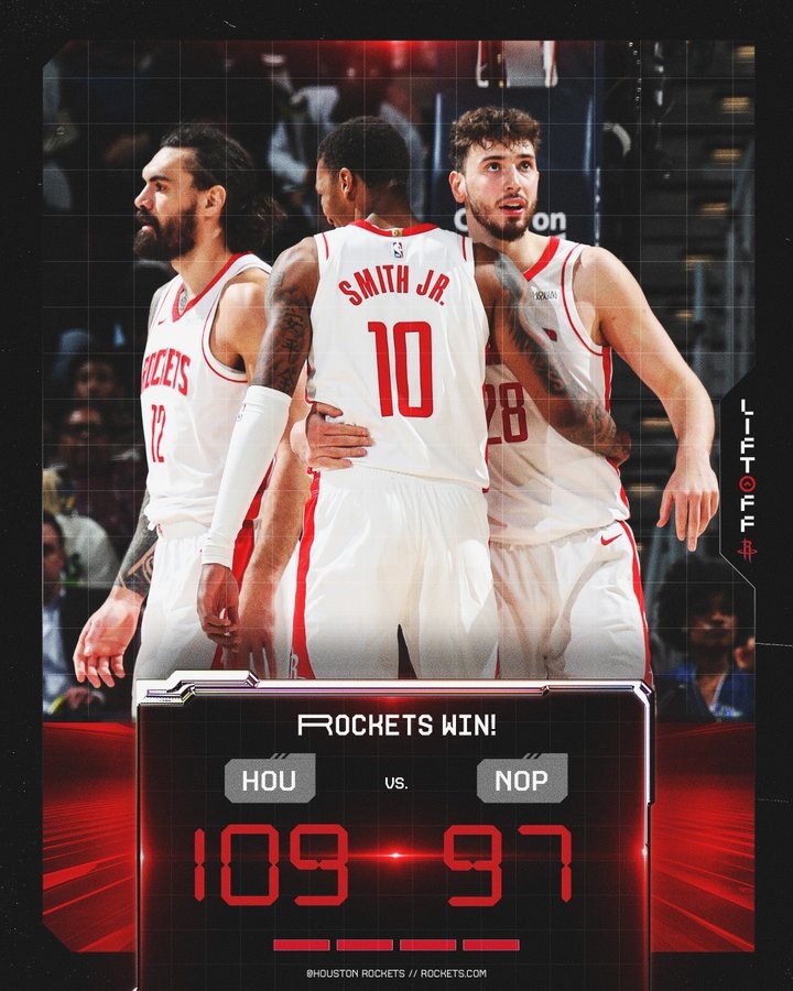 - 火箭官方晒赢球海报:申京、亚当斯、小贾巴里一起登上封面