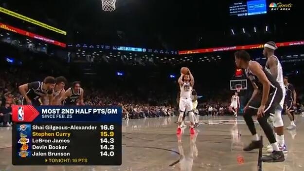 2月25日以来下半场场均得分:库里15.9仅次于SGA 詹姆斯排第三