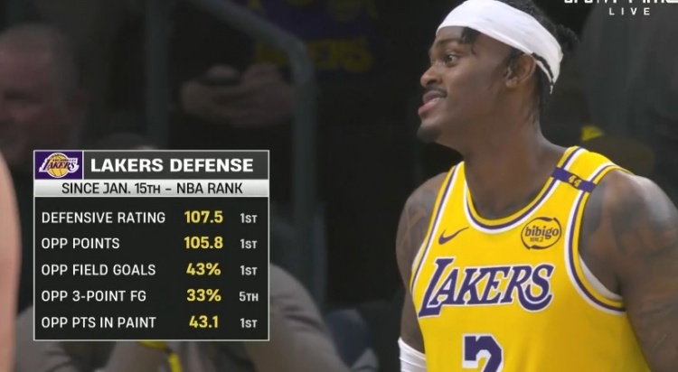 1月15日至今,湖人防守效率值107.5 ,联盟第1;限制对手场均得分105.8分 ,联盟第1;限制对手投篮命中率43% ,联盟第1;限制对手三分球命中率33% ,联盟第5;限制对手禁区得分43.1分 ,联盟第1。