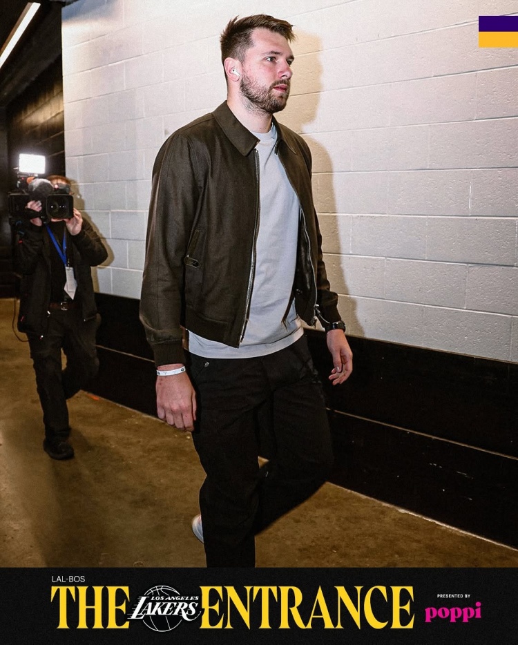 湖人众将入场穿搭:东契奇低调如常 文总夹克套卫衣 老詹帽子吸睛