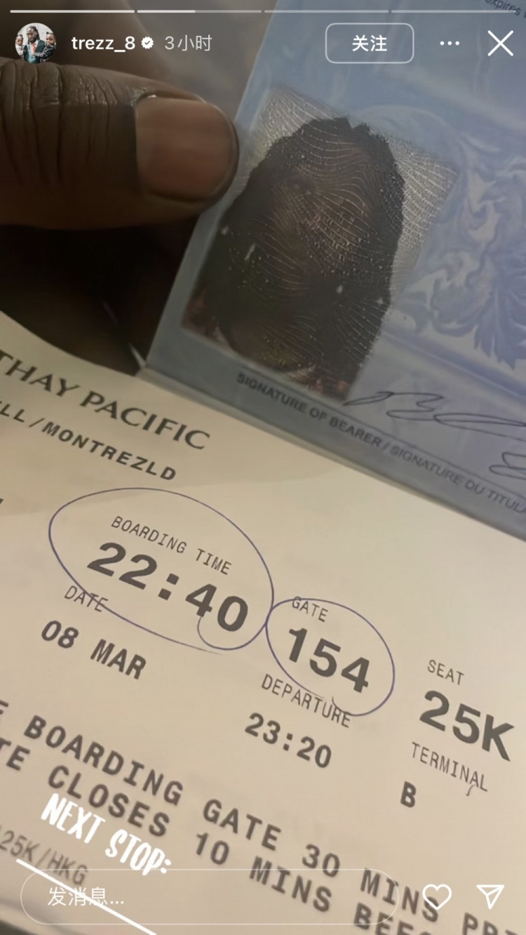3月9日讯 哈雷尔今天更新社媒,晒出了自己的机票以及准备登机的图片。