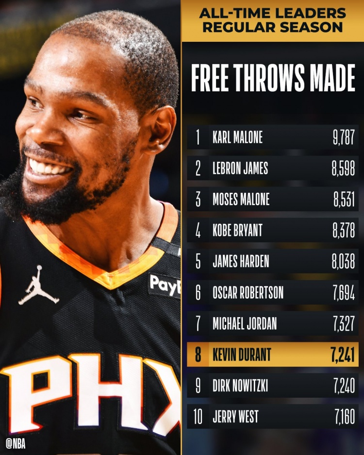 ❗KD常规赛罚球命中数达到7241次 超越诺维茨基升至历史第8!