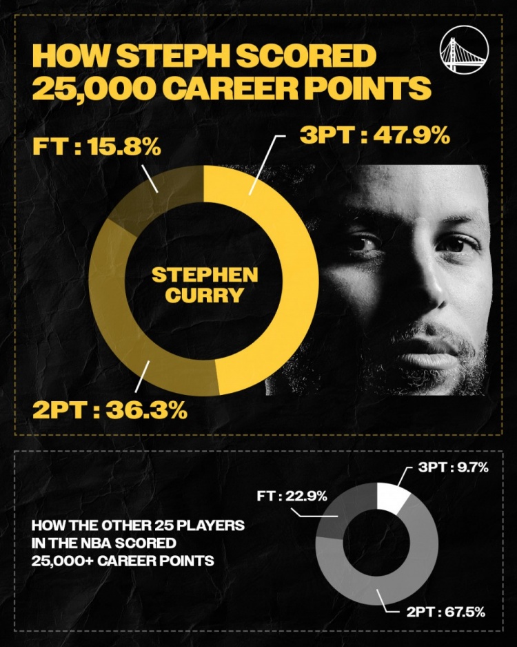 独树一帜!库里25000分中得分方式占比:三分47.9% 罚球仅15.8%