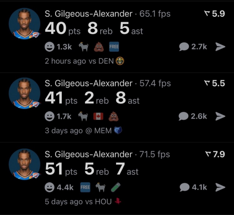 这样以来,亚历山大已经连续3场比赛砍下40+,雷霆队史继威少后第二人!