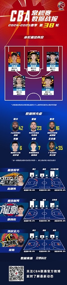 - 常规赛第38轮最佳阵容:王浩然、胡金秋、曾凡博、赵继伟、徐杰