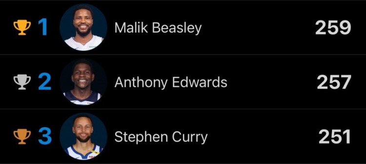 最终谁会第1?联盟三分榜前3:比斯利259 华子257 库里251