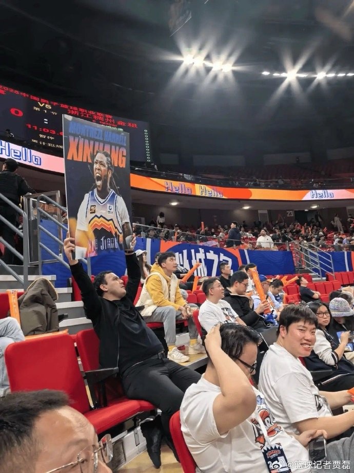 这!浙江客战上海 有球迷举着哈雷尔身穿新疆球衣照为上海加油
