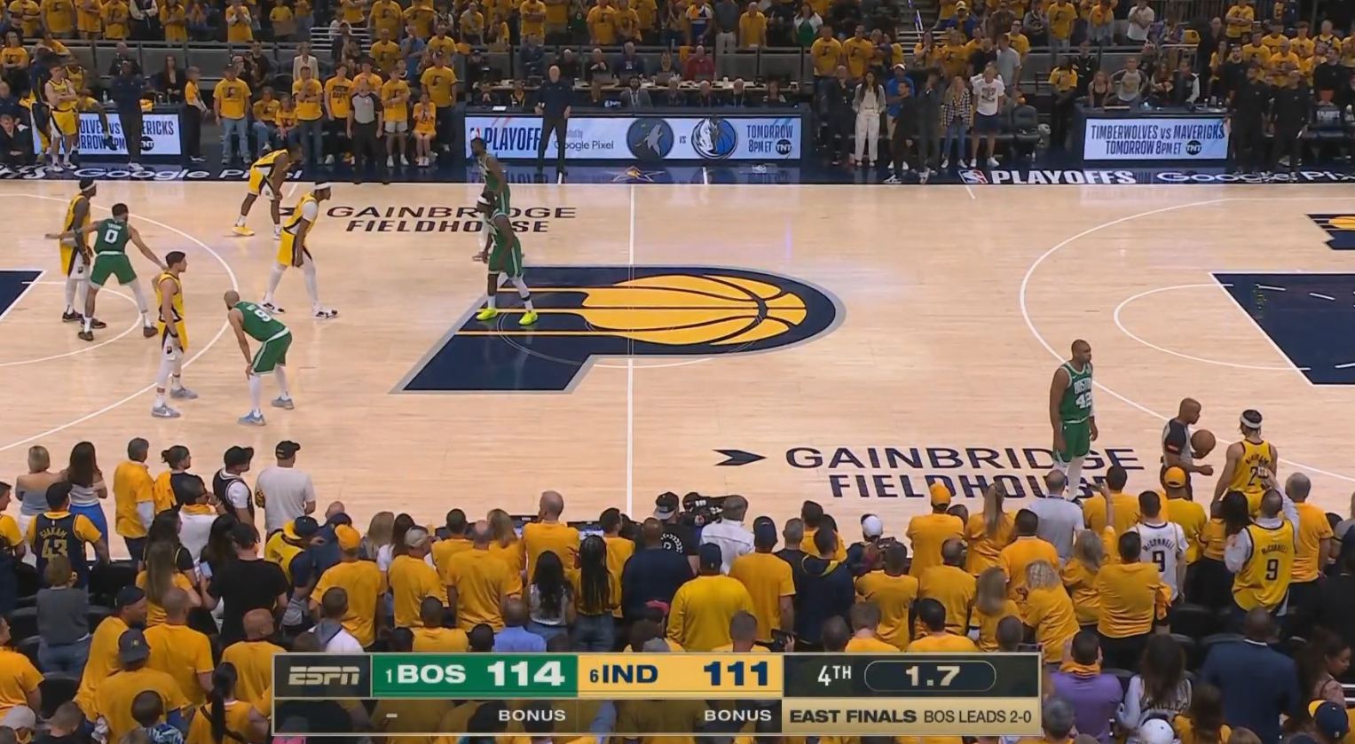 值得一提的是,上赛季步行者面对凯尔特人(东部决赛G3)曾使用这个战术,当时比分都一样,而且发球人也是同一个(安德鲁-内姆哈德),不过最后内史密斯的绝平三分球没投进。