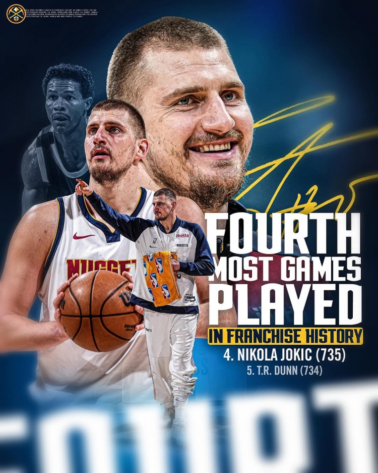 这是约基奇代表掘金出战的第735场比赛,超越T.R-邓恩,上升至队史第四。
