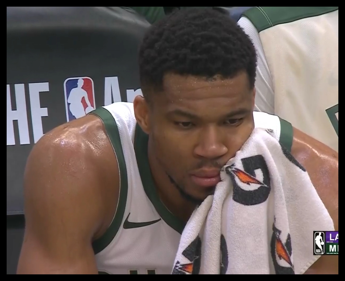 在想什么呢?雄鹿大比分领先湖人 字母哥在替补席若有所思~