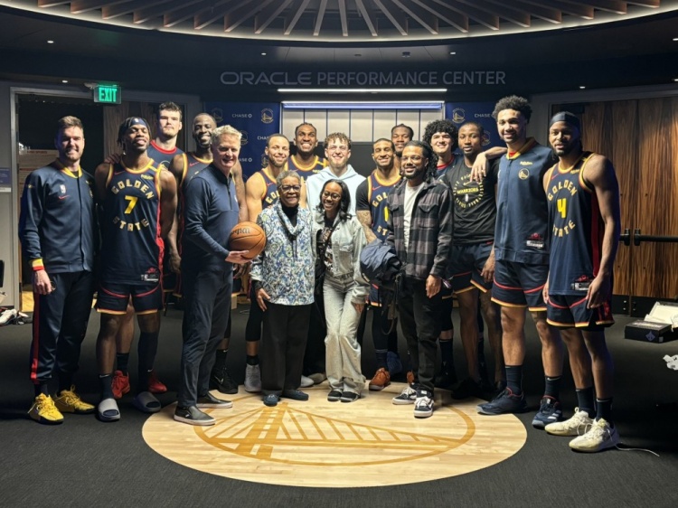 赛后,勇士队工作人员做出温馨的安排,阿尔-阿特尔斯的妻子将比赛用球交给了科尔,众人一起合影留念。
