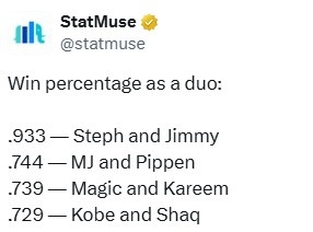 库里+巴特勒胜率93.3%!美媒对比:乔丹皮蓬74.4% 科比鲨鱼72.9%
