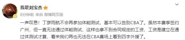 原文写道:“一声叹息!丁彦雨航不会再参加体能测试,基本可以告别CBA了。虽然本赛季签约广州,但一直无法通过体能测试,这样也拿不到合同规定的工资,工资是建立在通过体测试才算,看来我们再也无法在CBA赛场上看到四字外援了。 ”