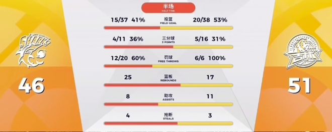 回来后,吉林男篮及时调整,里突外投又打出了一波5-0,34-40,这一次换成了上海队叫停。回来后,李添荣和大王纷纷命中罚球,将比分追至38-42。但除此之外,进攻端却频频出现失误,始终没能再次实现比分上的反超。次节还剩1分钟,每当大鲨鱼快要追平比分时,吉林男篮都能反击,拉开分差。随着吉林队威尔逊的最后一记暴扣,半场比分定格为46-51。