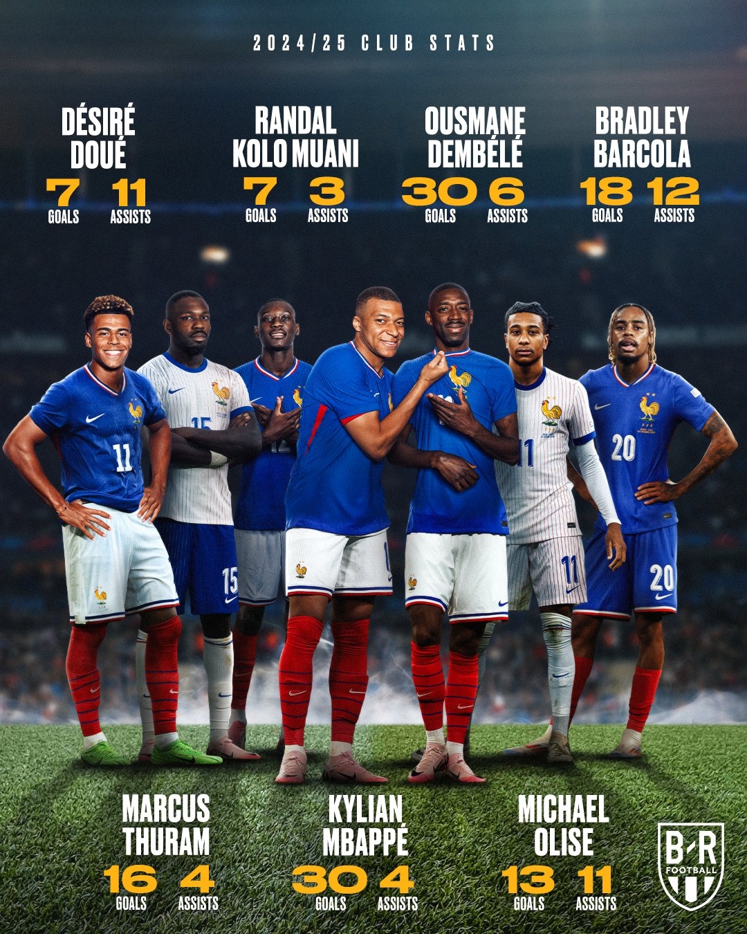 本赛季到目前为止,法国队7名进攻球员(杜埃、穆阿尼、登贝莱、巴尔科拉、小图拉姆、姆巴佩、奥利赛)的统计数据为: