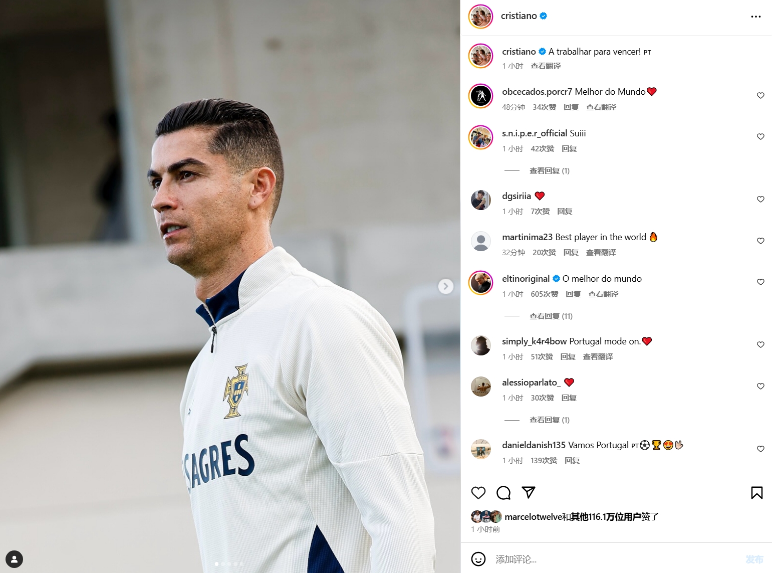 3月19日讯 不久前,正在葡萄牙国家队备战的C罗更新了社交媒体。