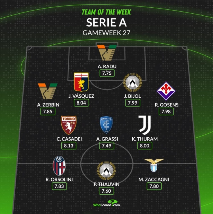 3月4日讯 意甲第27轮联赛已经完赛,whoscored也统计了本周意甲评分最佳阵容,凯夫伦-图拉姆领衔。
